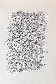 These paintings are built by layering words or phrases. The oil is applied in my block or script handwriting, or some variation of it. There is no hierarchy or focal point, just repetition and rhythm. The overlapping words may beg deciphering, but cryptography is not the goal. The words make a statement beyond their literal meaning to conjure a new interpretation. I typically use text that is poignant, inspiring, or thought provoking.